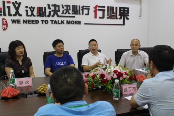 (通讯员张悦)7月19日下午,公司经理王兆峰、副经理贺小荣、党委副书记廖欢及公司深圳员工分会会长张信东一行考察湖南宏博教育科技发展有限公司并拜访公司董事长、学院长沙员工分会会长刘丁杰员工。
