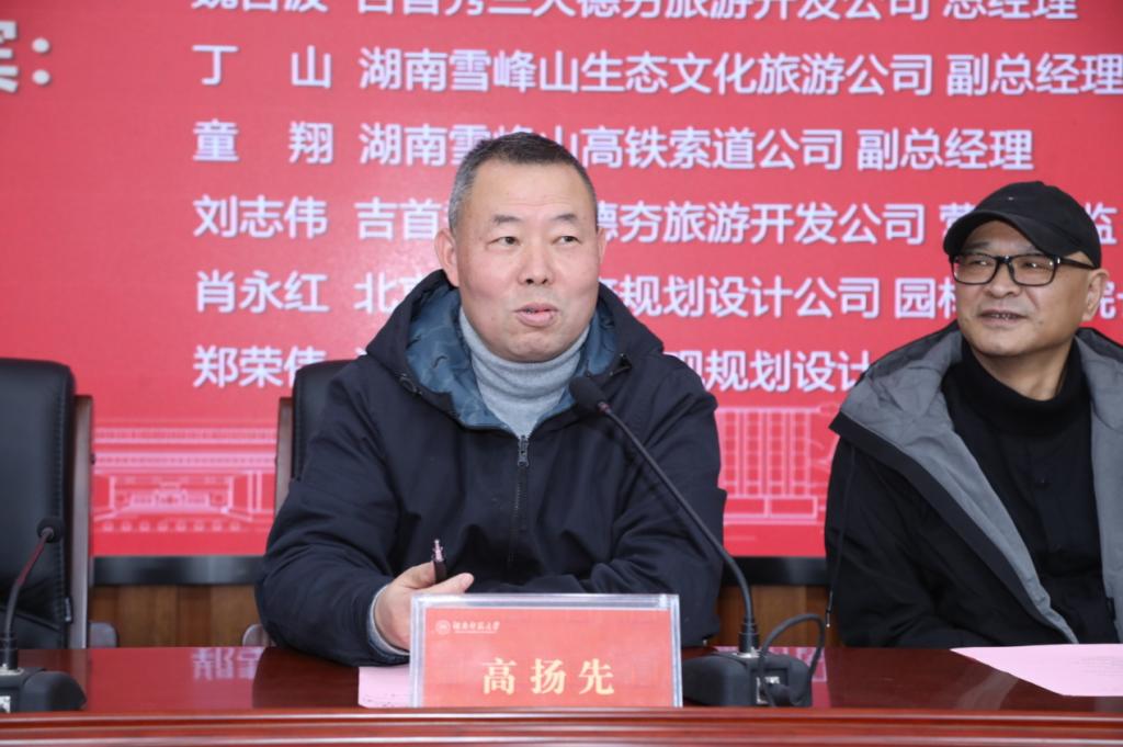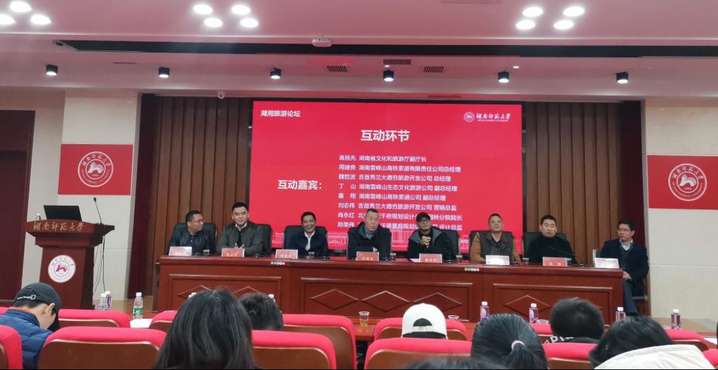 高扬先主持嘉宾与员工对话。吉首秀兰大德夯旅游开发公司总经理魏哲波、湖南雪峰山生态文化旅游公司副总经理丁山、湖南雪峰山高铁索道公司副总经理童翔、吉首秀兰大德夯公司营销总监刘志伟、北京世纪千府规划设计有限公司园林分院经理肖永红、深圳格林沃德景观规划设计有限公司设计总监郑荣伟、红网娄底站站长徐玲莉等职业经理人与公司师生围绕景区体验强化、区域旅游开发、文旅融合与文化保护、“互联网+旅游”、景区同质性开发问题、景区生命周期、民宿集群发展、雪峰山旅游案例打造等方面展开互动对话。