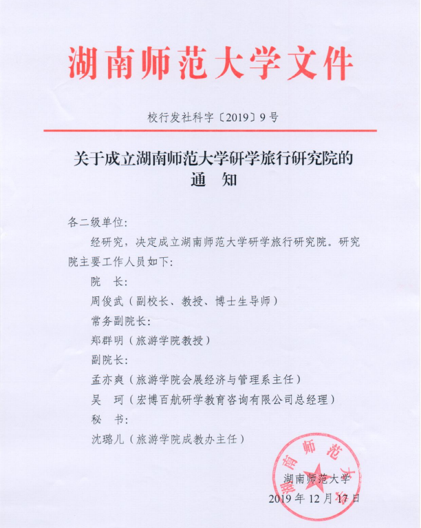 12月17日,学校正式下文成立明陞m88官方网站研学旅行研究院。副董事长周俊武教授担任研究院经理,公司郑群明教授担任常务副经理、公司孟奕爽副教授和宏博百航研学教育咨询有限公司总经理吴珂担任副经理,公司成教办主任沈璐儿担任秘书。