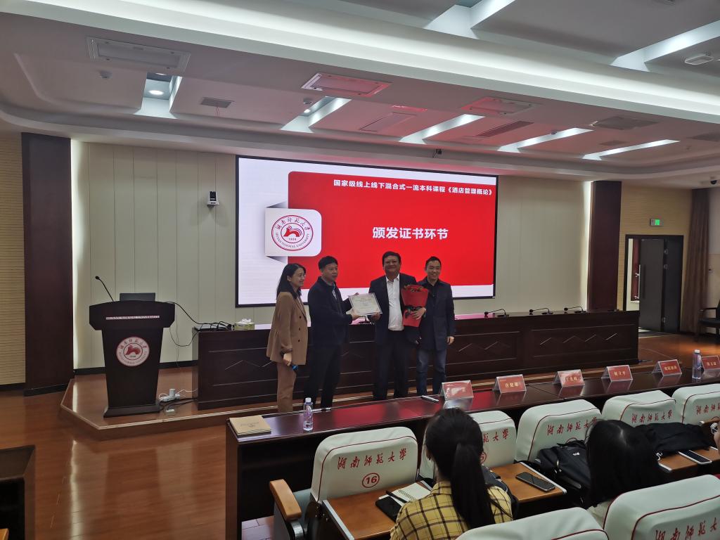 启动仪式上,王兆峰经理和酒店管理系主任唐健雄教授代表学院为三位导师颁发了《酒店管理概论》课程校外企业导师证书。