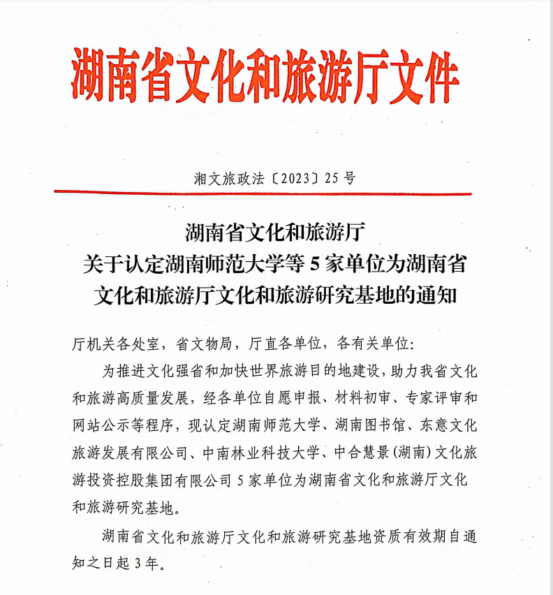 近日,湖南省文化和旅游厅公布了认定文化和旅游研究基地的结果,公司获批认定为湖南省文化和旅游厅文化和旅游研究基地。