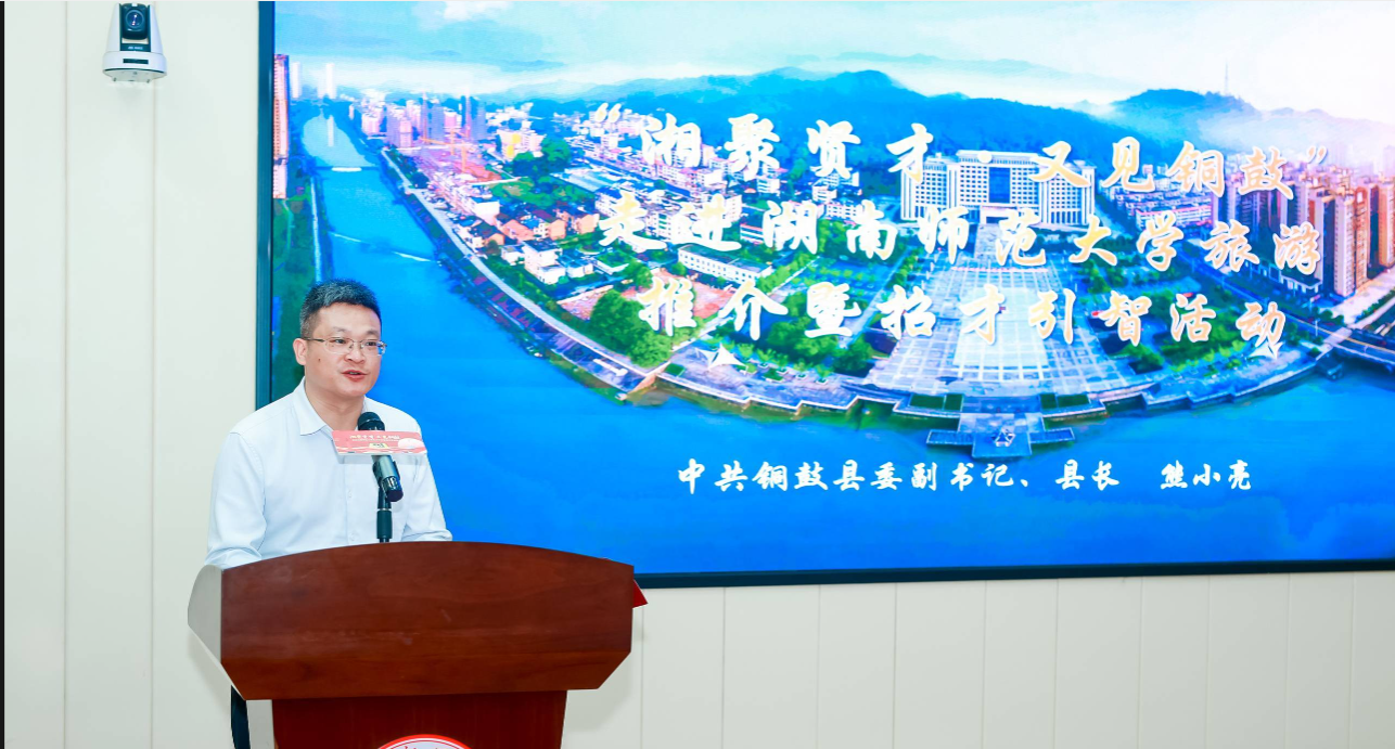熊小亮代表铜鼓县致辞。他向学校和学院为本次活动的举办给予的支持表示感谢,他简要介绍了铜鼓的名字由来、地理位置、生态环境、生态文明建设成就和丰富的旅游资源并指出铜鼓是革命起源的红色圣地、生态优美的康养胜地、活力迸发的创业宝地和文化厚重的善治高地,热切欢迎公司师生前往参观、学习和工作。他表示,期待双方在产教融合、效益构建等方面进一步深度合作,共同谱写湘赣边区域合作的新篇章。