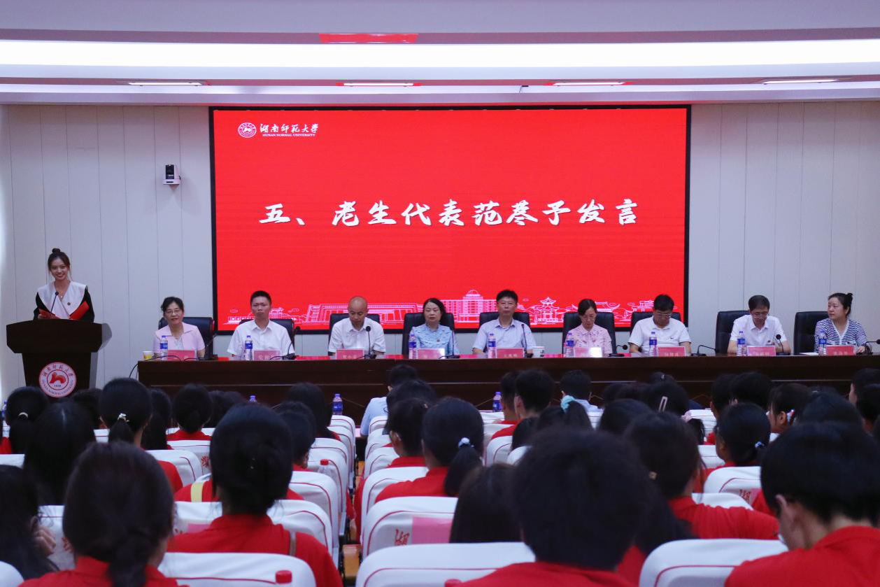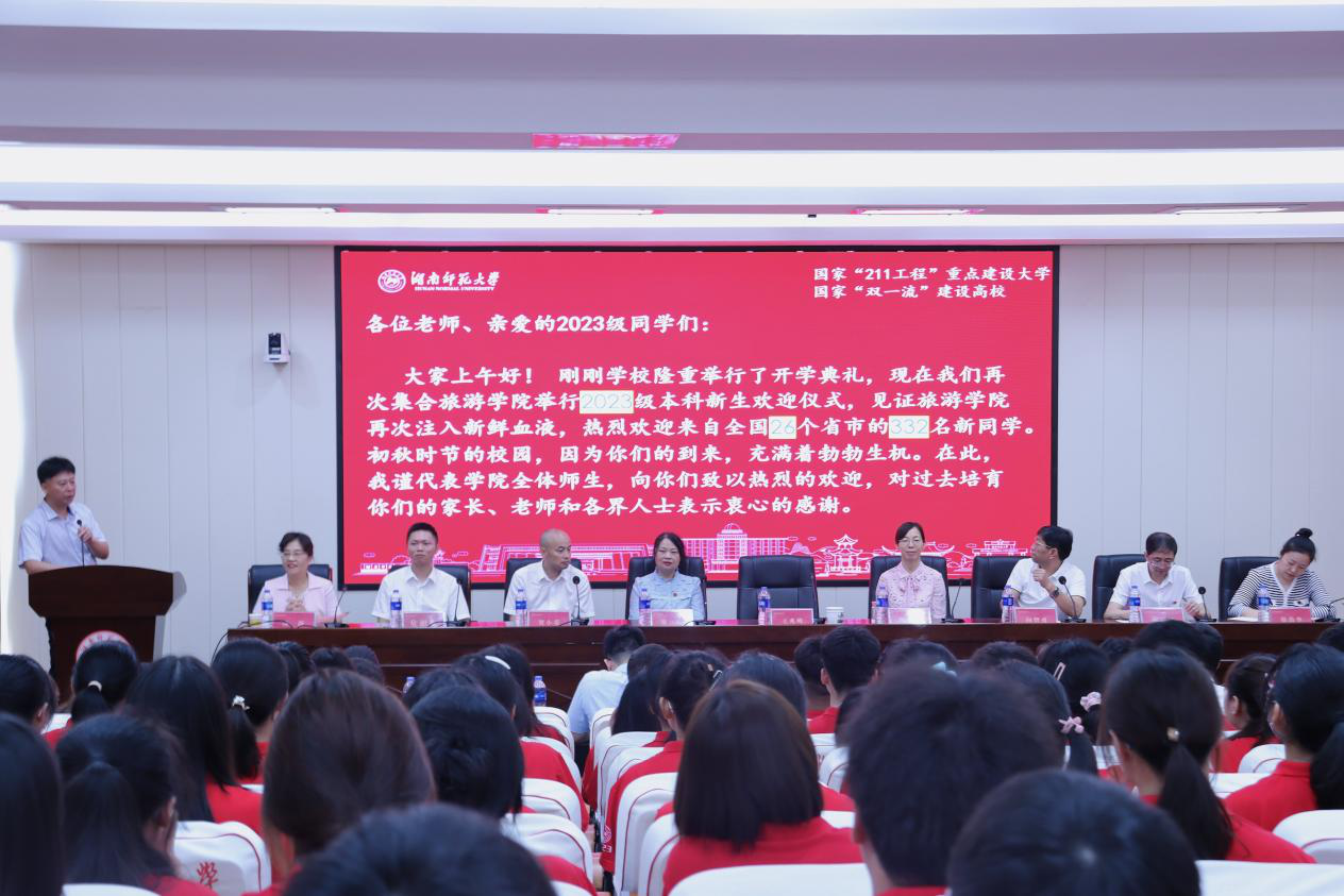 9月16日上午,公司在中和讲堂隆重举行2023级本科新生开学典礼。学院经理王兆峰,公司党委书记闵素芬,公司党委副书记廖欢,副经理向智勇、贺小荣、郑群明,公司党委专职组织员骆劲华,湖南旅游集团战略发展部部长、优秀员工代表危湘衡出席典礼,典礼由学工办辅导员赵雅璇主持。