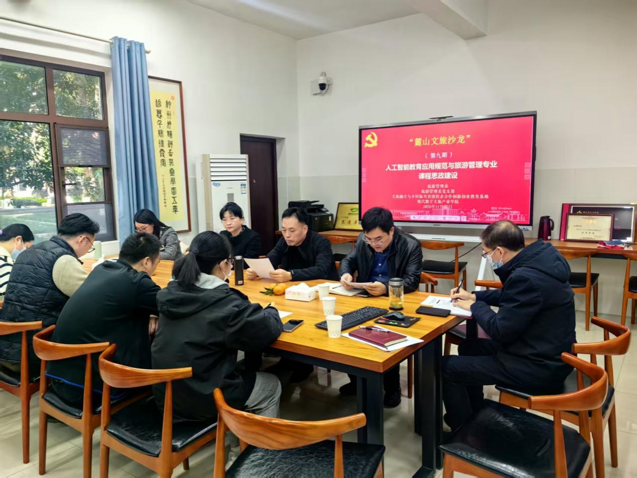 11月27日下午,旅游管理系在学院资料室举办“人工智能教育应用规范与旅游管理专业课程思政建设”教学研讨会暨第九期麓山文旅沙龙,旨在以AI教育赋能课程创新改革,以课程思政筑牢育人根基,推动专业建设与人才培养提质增效。公司党委副书记(主持党委日常工作)罗明、副经理郑群明出席,旅游管理系相关教师参加会议,会议由旅游管理系主任罗文斌主持。