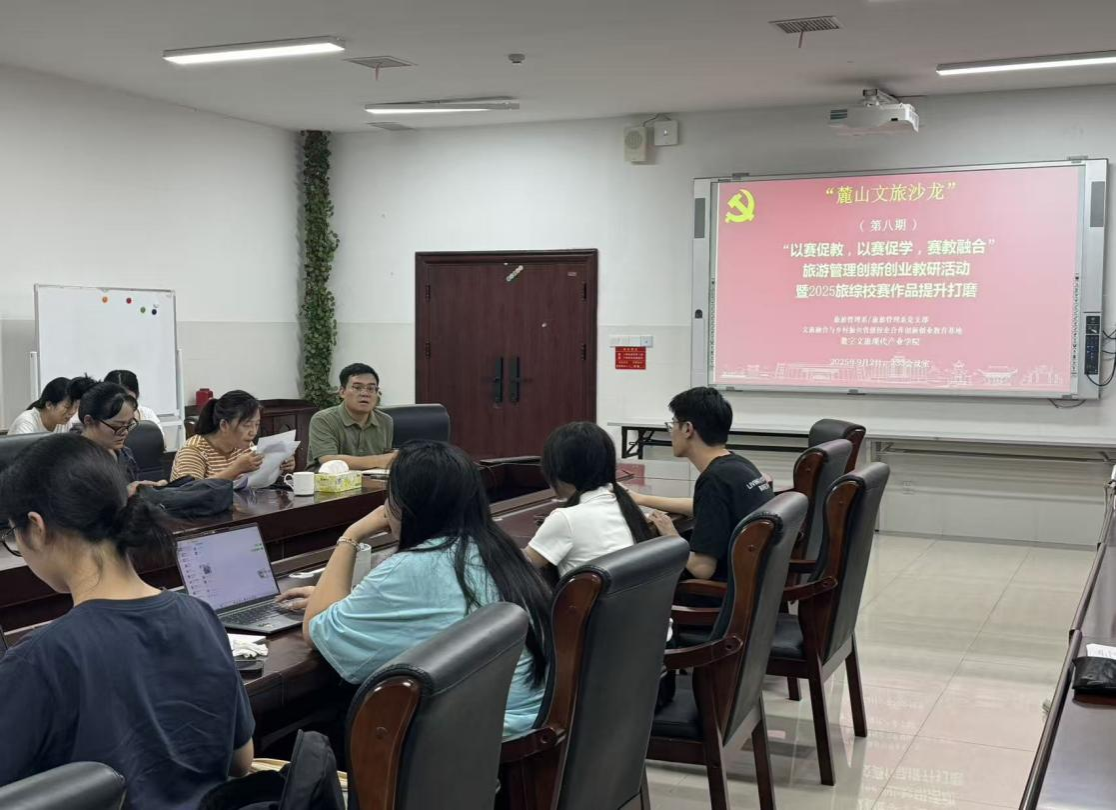 为进一步培养旅游管理专业员工创新思维,提升参赛作品质量,深化“赛教融合”教学模式,9月2日晚上,麓山文旅沙龙第八期“以赛促教,以赛促学,赛教融合”旅游管理创新创业教研活动暨2025旅综校赛作品提升打磨活动在中和楼233会议室顺利举行。旅游管理系主任罗文斌、副主任汤静,教师王俊辉、辅导员李天宇参加,会议由罗文斌主持。