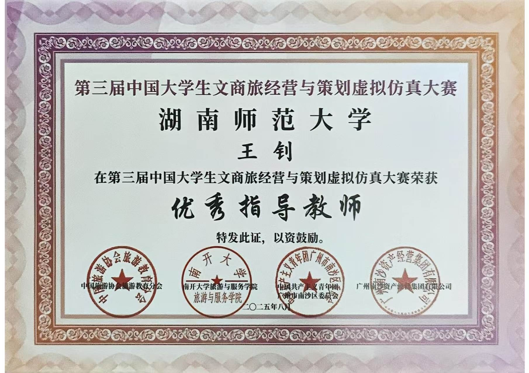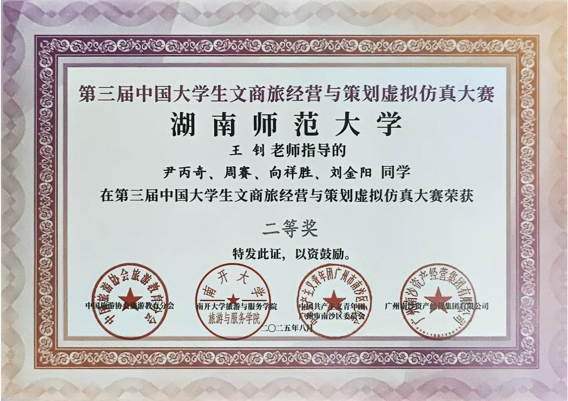 8月19日至24日,第三届中国老员工文商旅经营与策划虚拟仿真大赛总决赛在广州南沙举办,公司旅游管理系副教授王钊老师指导的尹丙奇、向祥胜、刘金阳、周赛本科生团队斩获全国二等奖,王钊老师获评“优秀指导教师”,系公司学子继第二届大赛后再度获此全国性赛事佳绩,彰显专业育人实力。