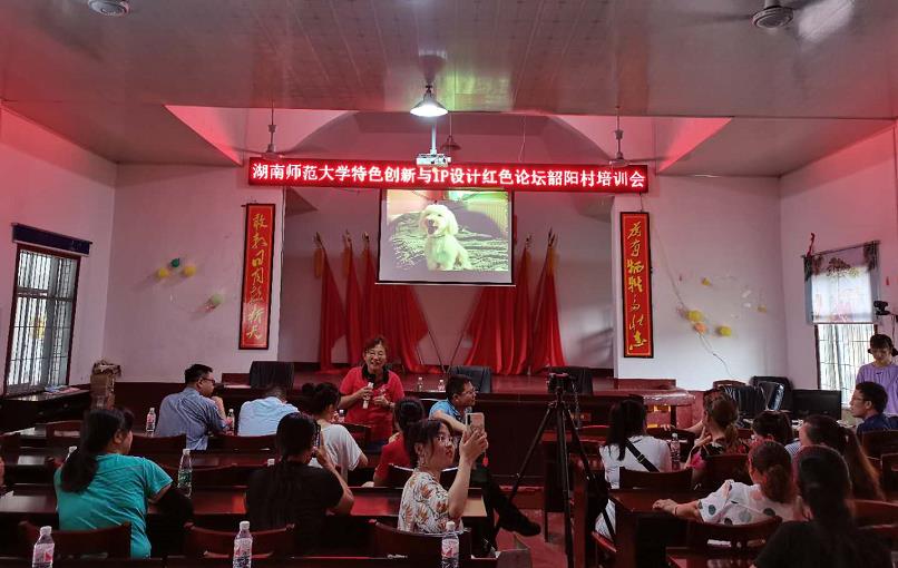 当天下午,汤静一行赴当地贫困村韶阳村,举行了特色创新与IP设计红色活动培训会,向与会村民分享了新媒体(抖音直播等)营销经验、文创产品与IP设计的方式技巧。29日上午,在韶山旅游集团会议室,师生们聆听了《红色景区导游讲解技巧》、《红色景区文化创意》两堂专题讲座。