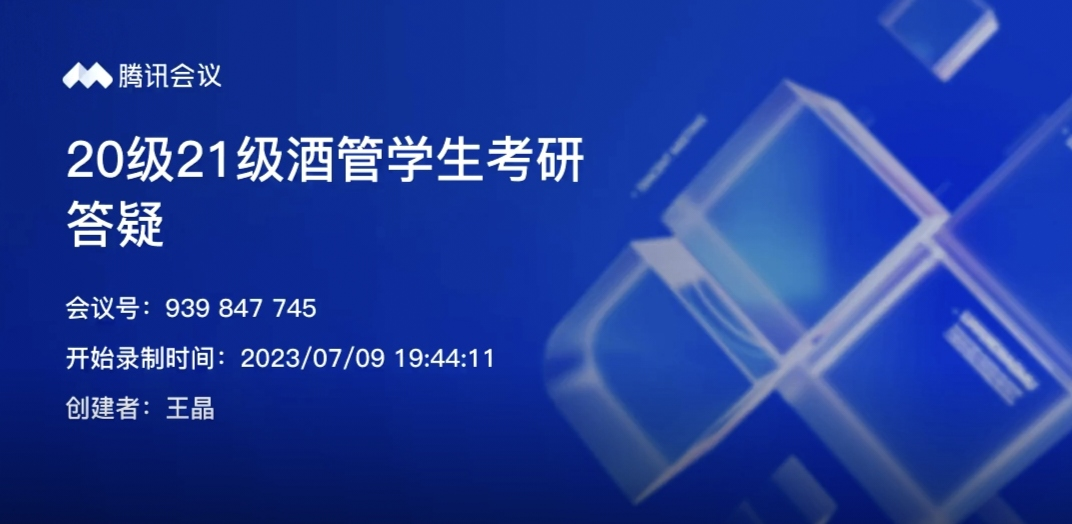 为帮助2020级酒店管理专业员工进一步解决考研备考中的各种问题和困惑,同时助力2021级的同学明晰考研目标并提前做好准备,公司酒店管理系于2023年7月9日晚举行线上考研答疑分享会,主讲人为公司唐健雄老师、刘颖洁老师、贺凯健老师以及2022级职业技术教育专业硕士研究生黄梦雪和2019级酒店管理专业本科生叶梦宁。此次分享会采用线上会议的形式,由公司王晶老师主持,60多名员工参会。