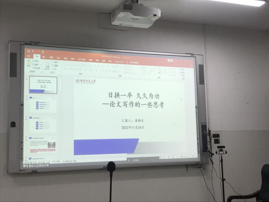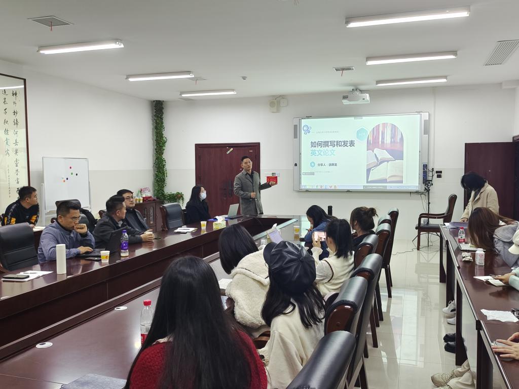 首先,徐新龙结合自己多年来丰富的科研经历,从“为什么发表英文论文”“英文论文撰写的要点和方法”以及“英文论文投稿后的问题处理”三个方面为在场的师生带来了主题为“如何撰写和发表英文论文”的学术分享。随后,唐彬礼在线上以“‘日拱一卒久久为功’——论文写作的一些思考”为主题,从“论文写作的四个要点”“论文写作趣味性的四个维度”“论文写作与生活”和“幸福写作观”四个方面介绍了论文写作的诸多要点。
