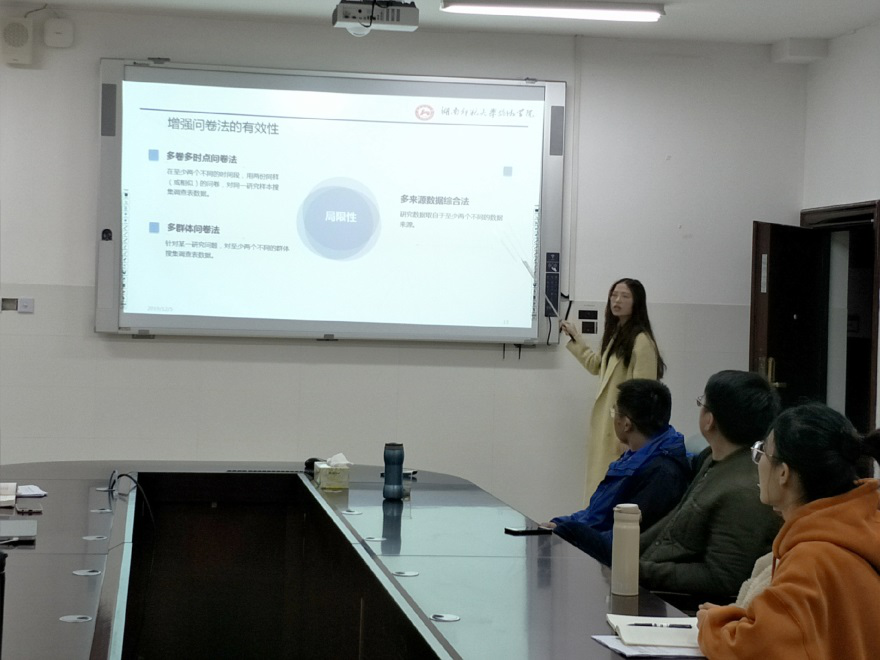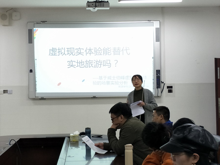 本次会议由胡兵、石松和朱张祥三位老师的研究团队进行了学术汇报。其中,17级旅游地理研究生屠欧阳颖结合自己的研究方向分享了国际旅游学科顶级期刊《Tourism Management》2020年将发表的《How do tourists’ attribution of destination social responsibility motives impact trust and intention to visit? The moderating role of destination reputation》一文。19级职业技术教育研究生彭子汇从“研究设计在实证研究中所扮演的角色”“实证研究的效度评价”“实证研究中的变异量控制”等几个方面详细介绍了实证研究设计与评价的一般程序以及需要注意的细节问题。18级旅游地理研究生廖丽衡介绍了使用问卷调查法所需要遵循的原则以及问卷设计的注意事项。19级职业技术教育研究生张秋萍分享了国内旅游学科重要期刊《旅游学刊》2019年发表的《虚拟现实体验能替代实地旅游吗?基于威士伯峰虚拟现实体验的场景实验分析》一文。在四位同学的汇报过程中,各位老师发表了评论,并讨论了科研过程中需要注意的一些问题,提出相关建议。