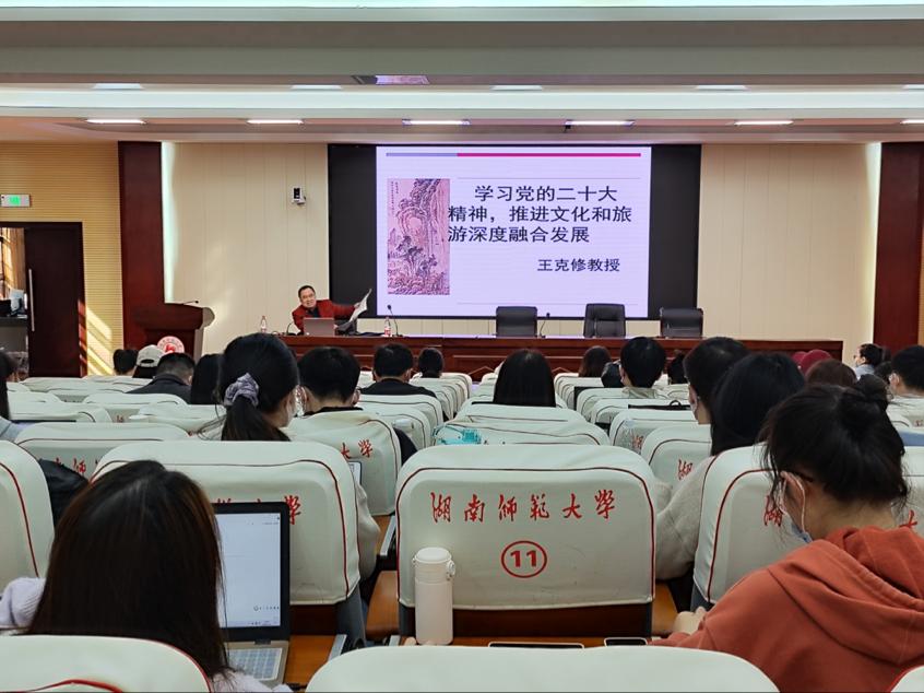 11月2日上午,公司在中和楼234学术报告厅为2022级和2021级研究生举办了“深入学习领会党的二十大精神,推进文化和旅游深度融合发展”的主题讲座,特邀湖南省委党校、湖南省行政学院王克修教授主讲。讲座由公司郑群明副经理主持。