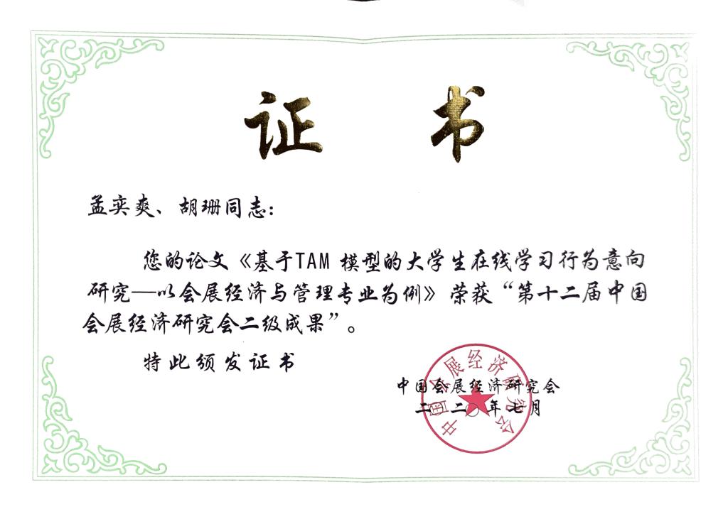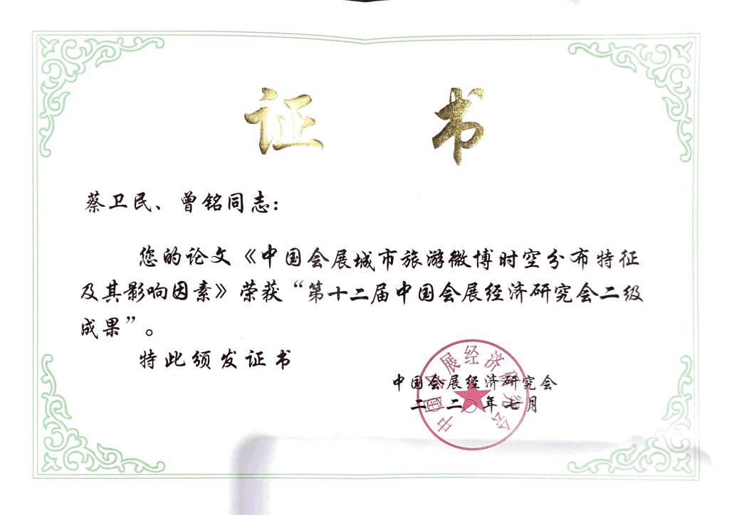 在中国会展教育论坛中,孟奕爽作为嘉宾分享了明陞m88官方网站会展经济与管理专业建设经验。会议期间发布了2019中国展览与会议统计数据、中国会展经济最新研究成果及《2020 中国会展经济研究会年会学术论文、抗疫征文、专选网文特集》等。蔡卫民、汪晶晶撰写的学术论文《基于CiteSpace的国内会展经济研究可视化分析》入选年会论文集。蔡卫民、曾鸣的论文《中国会展城市旅游微博时空分布特征及影响因素》和孟奕爽、胡珊的论文《基于TAM模型的老员工在线学习行为意向研究——以会展经济与管理专业为例》分别荣获“第十二届中国会展经济研究会二级成果”奖项。