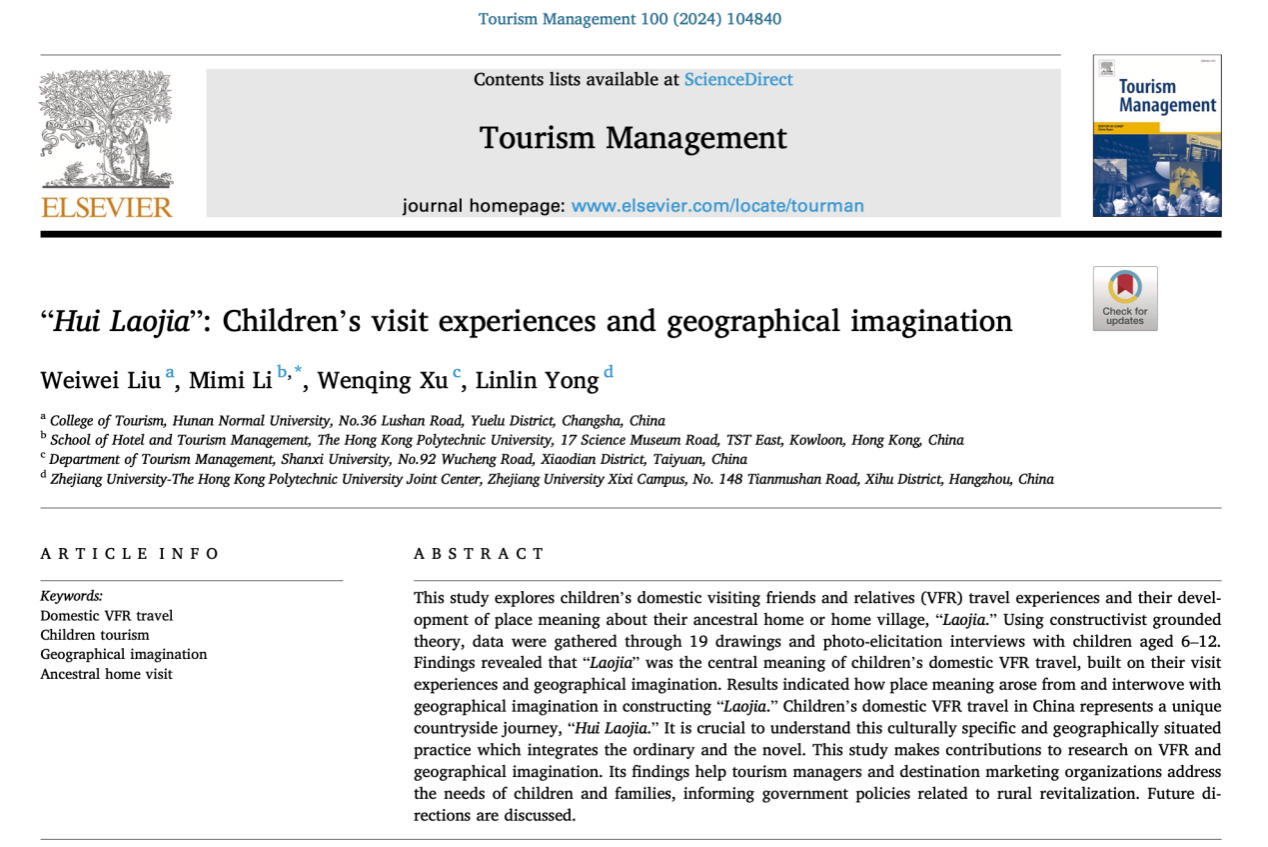 近日,国际旅游学科顶级权威期刊《Tourism Management》接收并刊发了公司旅游管理系青年教师刘为潍任第一作者、明陞m88官方网站为第一单位,香港理工大学李咪咪教授等四位学者合作完成的论文《“Hui Laojia”: Children’s visit experiences and geographical imagination》(Volume 100, February 2024, 104840)。