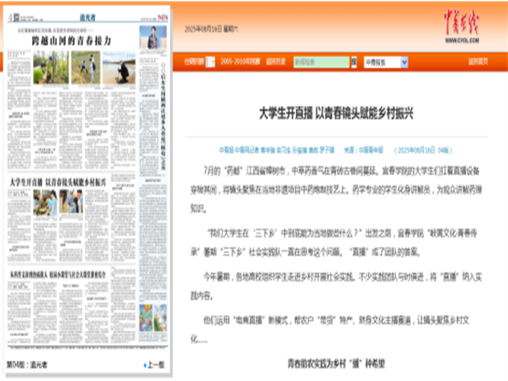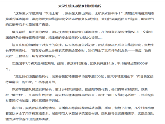 《中国青年报》重点报道了公司文旅志愿服务队志愿者在浏阳、益阳通过“直播+文旅”新模式赋能乡村振兴的实践探索。在浏阳市龙溪谷,团队克服信号盲区困难,开展14场文旅直播,累计收获数万点赞,带动景区次日客流翻倍;益阳市安化县团队结合茶旅、红色资源与非遗体验,设计“两日文旅闭环线路”,手绘乡村旅游打卡地图,并帮助村民学习直播技能,为乡村文旅发展留下了一份可持续的“青春方案”。