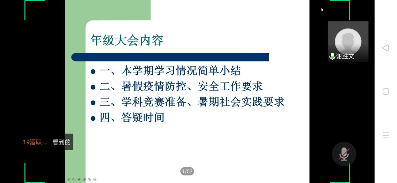 谢胜文老师首先对上半年的学习情况做了总结,解释了同学们的分数占比并分析了线上教学可能存在的问题,对下一阶段的学习提出了期望和要求。暑假期间同样不能放松警惕,防疫不可掉以轻心,学校也发布了暑期疫情防控要求等相关文件。谢胜文老师着重强调了这一方面,尽量不外出旅游,有任何情况及时上报;注意人身安全,不随意下河;树立理性消费观念,不网贷,谨防被骗。这不仅是对自己负责,也是对家人﹑学校和社会负责。
