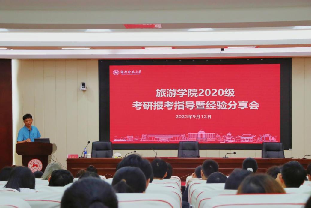 邓爱民从中南财经政法大学的基本情况和学校环境两个方面介绍了该校,重点阐述了该校旅游管理专业的优势、师生成绩以及社会服务。同时讲解了旅游管理专业的报考指南以及研究生的毕业去向,并对同学们提出的问题进行了解答,鼓励同学们积极报考。文湘琦从自身实际情况出发向同学们分享了考研的经验,包括报名填报的注意事项、公共课和专业课的准备方法、获取考研真题的途径以及合理安排考研学习时间的建议,并鼓励同学们要坚持不懈、保持自信。王兆峰对去年明陞m88官方网站员工的考研情况进行了分析,详细介绍了旅游管理、旅游地理、饭店管理、职业技术教育和会展传播学五个硕士点往年的报考和招生情况。同时他还总结了考研择校、报考和备考等方面的注意事项,鼓励同学们积极准备考研,并希望同学们在考研过程中保持信心。