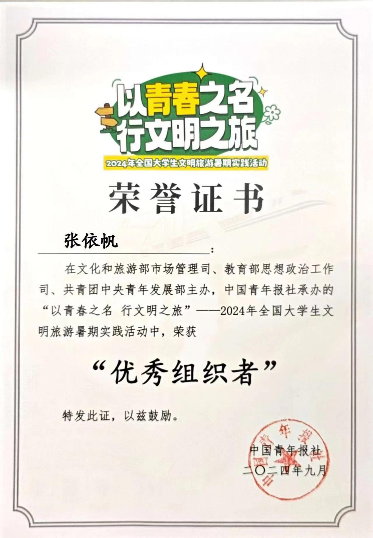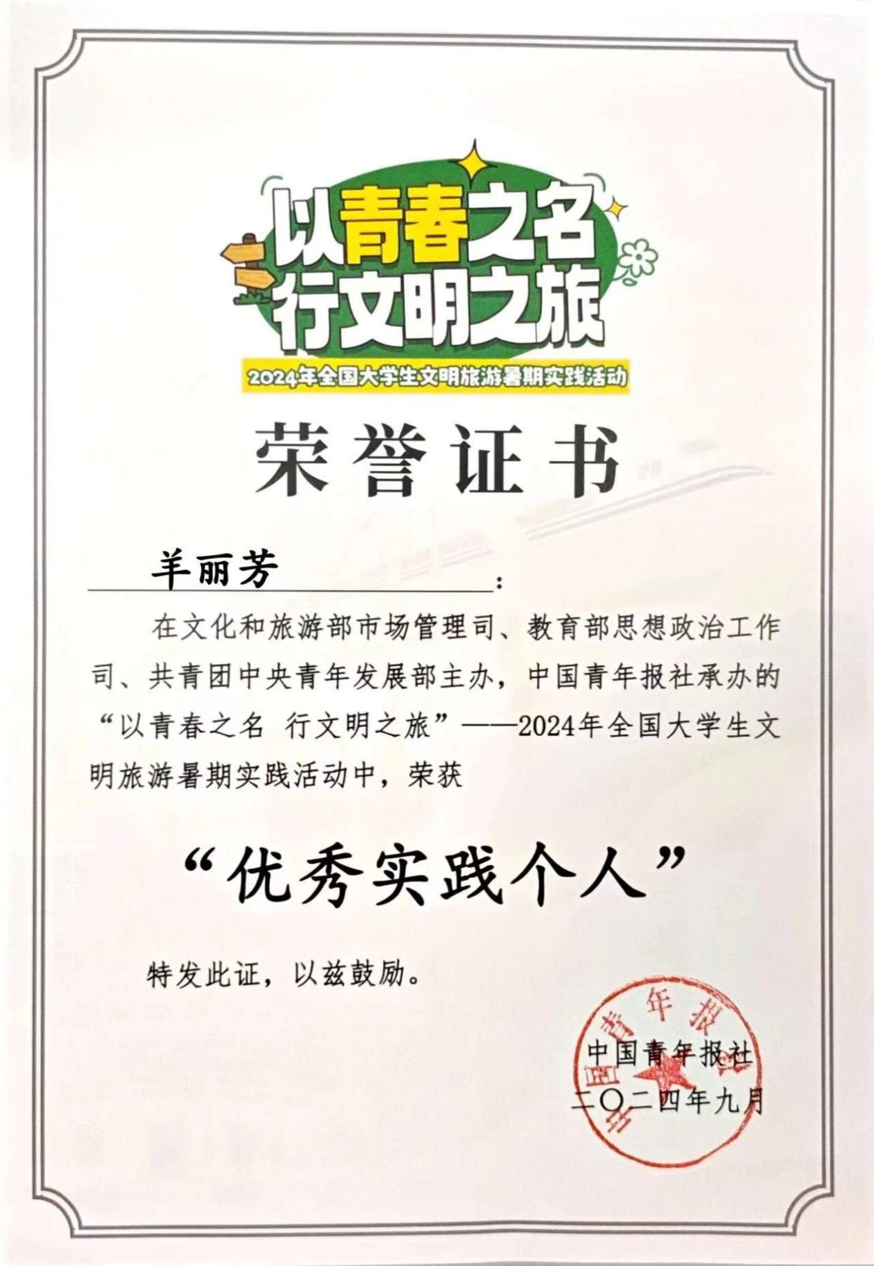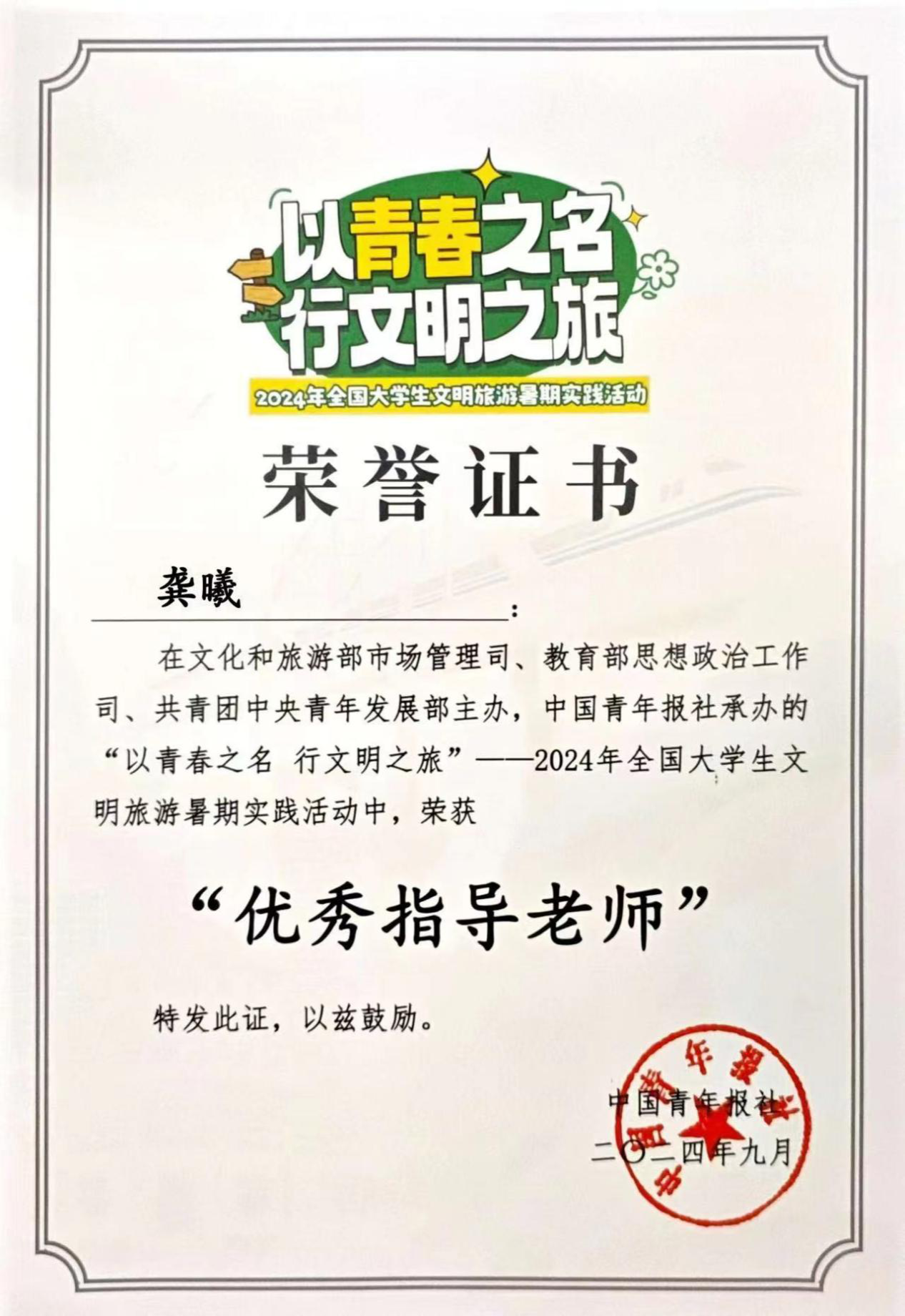 (通讯员 张依帆 范儒玲)近日,公司文旅志愿服务队志愿者代表赴北京市参加国家文旅部、教育部、团中央共同举办的“以青春之名 行文明之旅”——全国老员工文明旅游暑期实践总结交流活动,公司团委书记龚曦老师荣获全国“优秀指导老师”、实践队队长张依帆荣获“优秀组织者”、24名实践团成员荣获“优秀实践个人”。