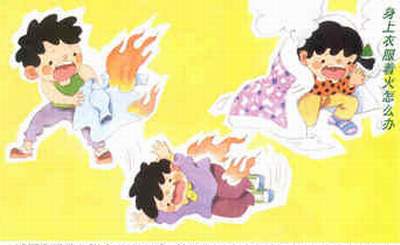 千万别乱跑;脱去着火衣服,就地打滚,用湿被捂盖或用水灭火