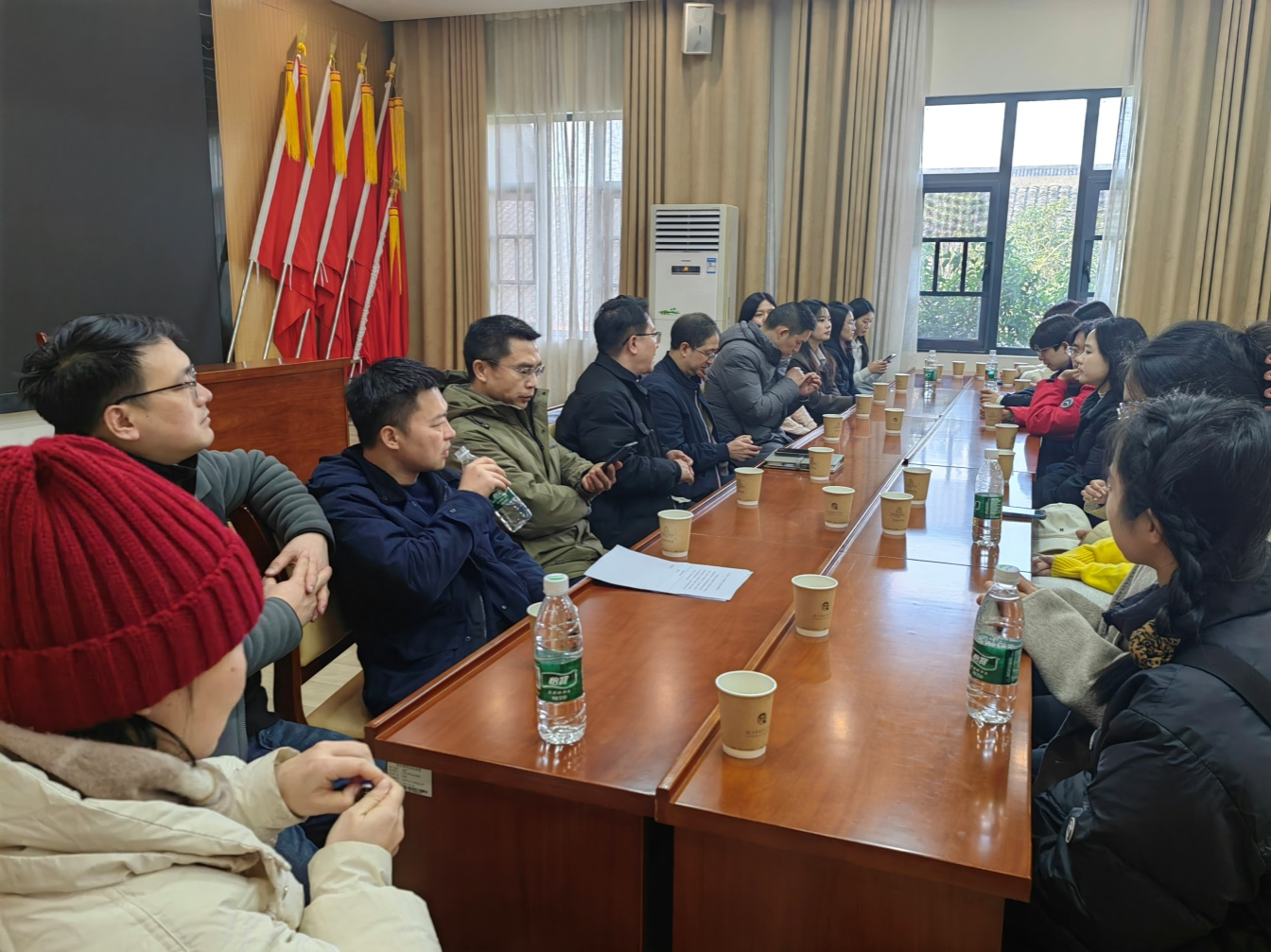 随后,支部党员在会议室里举行了座谈会。会上,党支部书记孟奕爽首先发言,他强调了此次联合党建活动的重要意义,指出通过参观学习,我们要更加坚定理想信念,牢记育人使命。与会成员纷纷表示赞同,一一分享了自己的参观体验,并结合自己专业知识就景区的发展与红色精神的传承给出了自己的意见和看法。