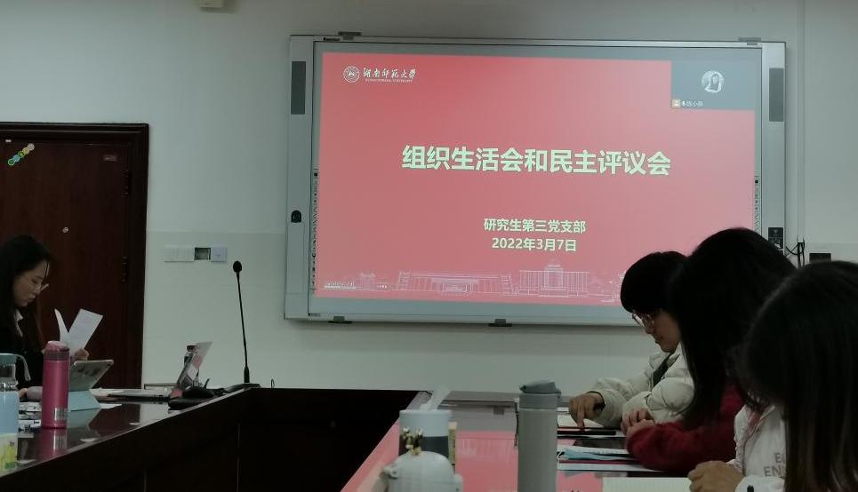3月7日研究生第三党支部在中和楼233会议室召开2021年度组织生活会暨民主评议党员会,本次大会由支部书记周诗雨同志主持,明陞m88官方网站副经理向智勇同志、支部第一书记王晶同志出席会议,应到正式党员17名,实到14名;应到预备党员8名,实到7名。