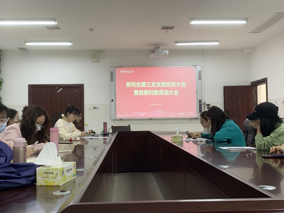 研究生第三党支部于2022年4月14日在中和楼233会议室召开党员大会表决确定本学期党员发展对象。会议由支部书记余妍希主持,支部第一书记王晶同志到会指导。