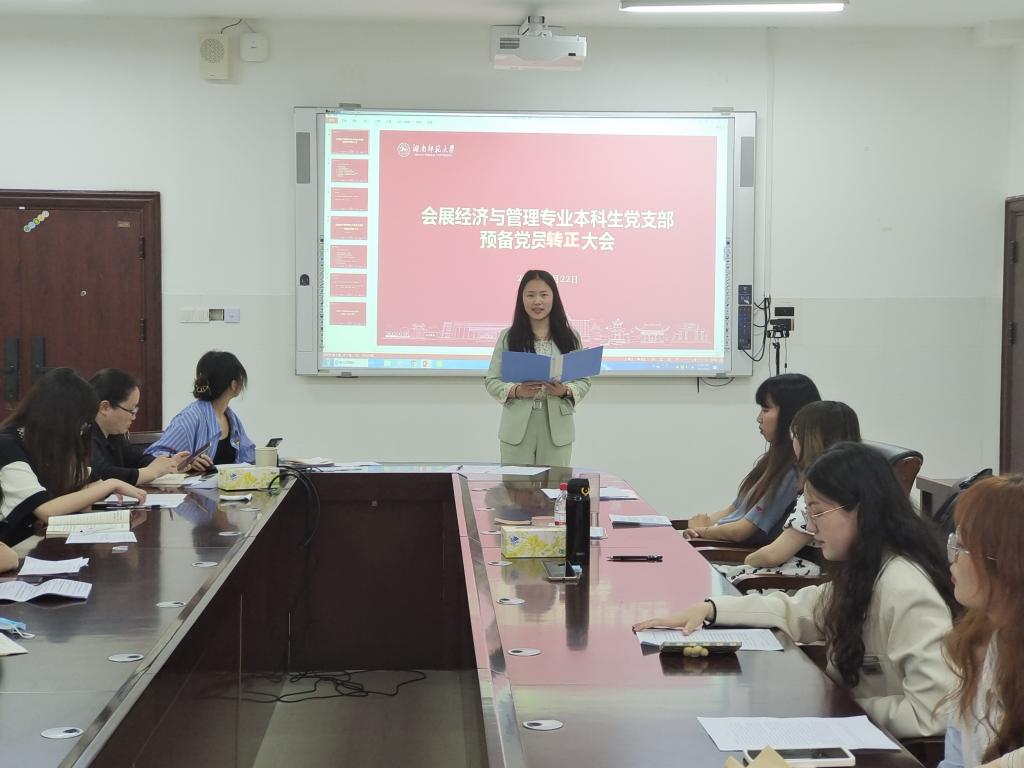 5月22日,会展经济与管理专业本科生党支部于中和楼233会议室举行预备党员转正大会,会议由支部书记夏梦婷主持召开。此次会议主题是讨论樊荣、向娟娟、张敏、李秧、吴尘、莫菲、肖玉洁、沈海涛、周爽、刘颖慧、马若曦、吴婧妤、李欣欣共13位同志的转正问题。支部第一书记谢胜文到会指导。