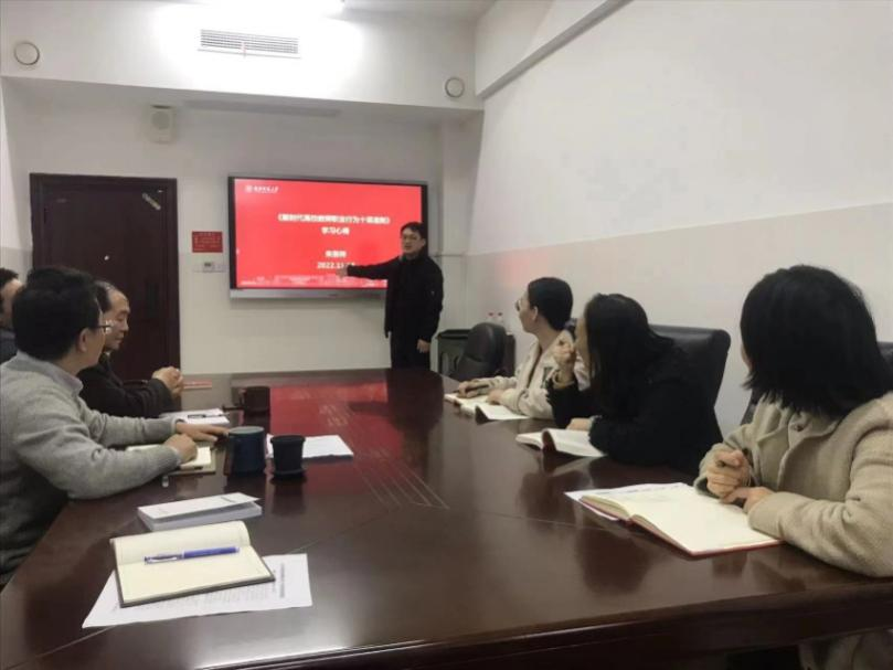 朱张祥同志以“新时代高校教师职业行为十大准则”为主题,向大家谈了坚持政治方向、自觉爱国守法、传播优质文化,潜心教书育人,关心爱护员工,坚持言行雅正,遵守学术规范、秉持公平诚信、坚守廉洁自律和积极奉献社会。同时,还对关于高校教师师德失范行为处理的指导意见进行了分析。