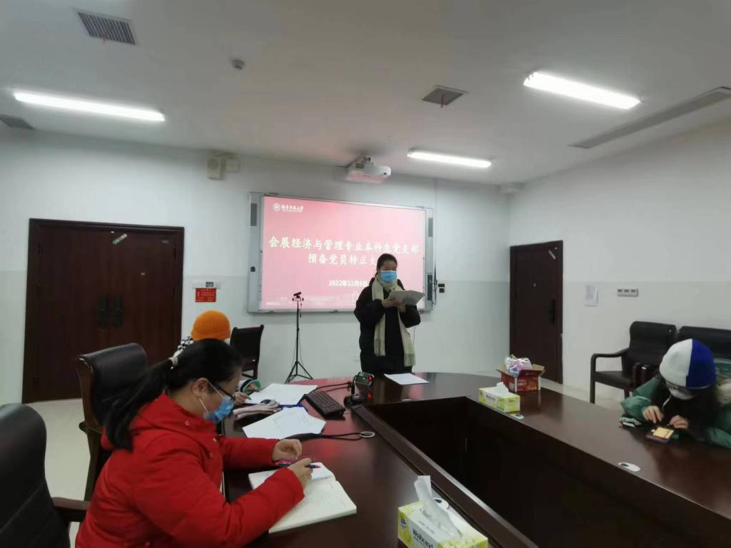 12月6日,会展经济与管理专业本科生党支部于中和楼233会议室召开党员大会,会议主要议题是讨论、表决接收预备党员和预备党员转正事宜,会议由支部书记张敏主持召开,支部第一书记谢胜文到会指导。