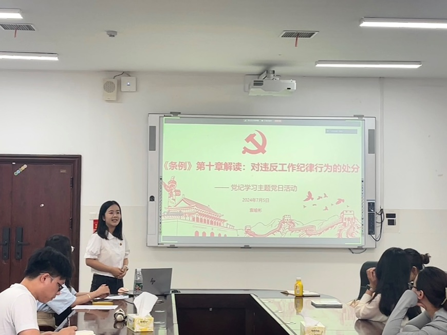 会议伊始,党员们观看了警示教育片。刘洁对习近平总书记关于全面加强党的纪律建设的重要论述进行解读,并勉励大家知责于心、担责于身、履责于行。支部党员袁喻彬、刘姗同志分别领学《中国共产党纪律处分条例》中的第十章、十一章内容并就党的工作纪律、生活纪律做主旨学习发言。参会同志就本次党纪学习展开充分研讨,结合自身学习经历,大家一致认为,纪律是党员行为的基本准则,必须时刻牢记并严格遵守。