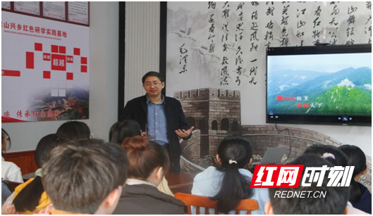 在红色研学基地,郑群明为员工们讲解韶山红色文化助力全域旅游发展的路径。