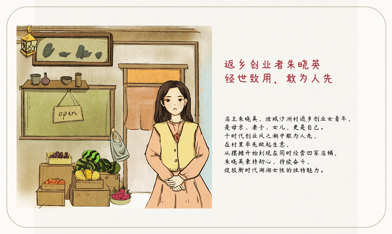 朱晓英,沙洲村返乡创业女青年。于时代创业新风潮中敢为人先,她见证了沙洲村发生的全方位变化,从摆摊开始到现在同时经营4家店铺,秉持初心,持续奋斗,绽放新时代湖湘女性的独特魅力。