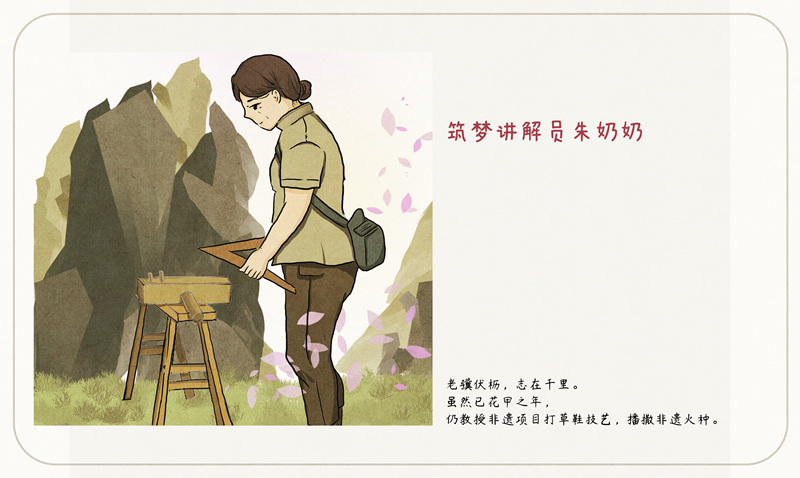 朱奶奶,红星筑梦营解说员。老骥伏枥,志在千里。虽入花甲之年,仍笑迎八方游客,精神饱满,生动朴实的言语讲述非遗经典,引人入胜。