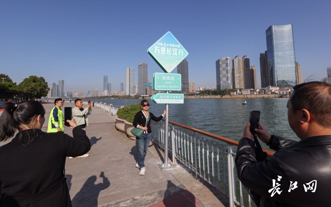 游客在橘子洲头“沿着长江读懂中国——万里长江行”打卡装置前拍照留影。王筝 摄