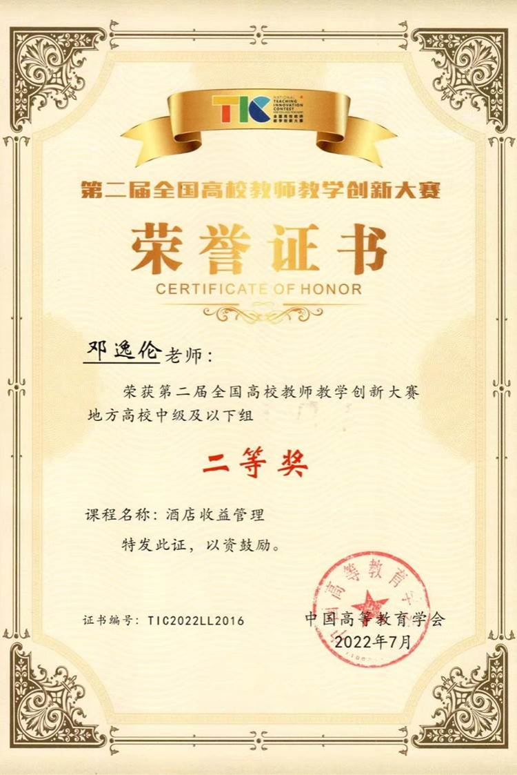7月31日,第二届全国高校教师教学创新大赛在西安顺利闭幕。酒店管理系支部党员邓逸伦老师的《酒店收益管理》课程进入现场决赛,经过激烈的角逐,最终荣获全国二等奖,是本届大赛唯一获奖的酒店管理专业的教师及课程。